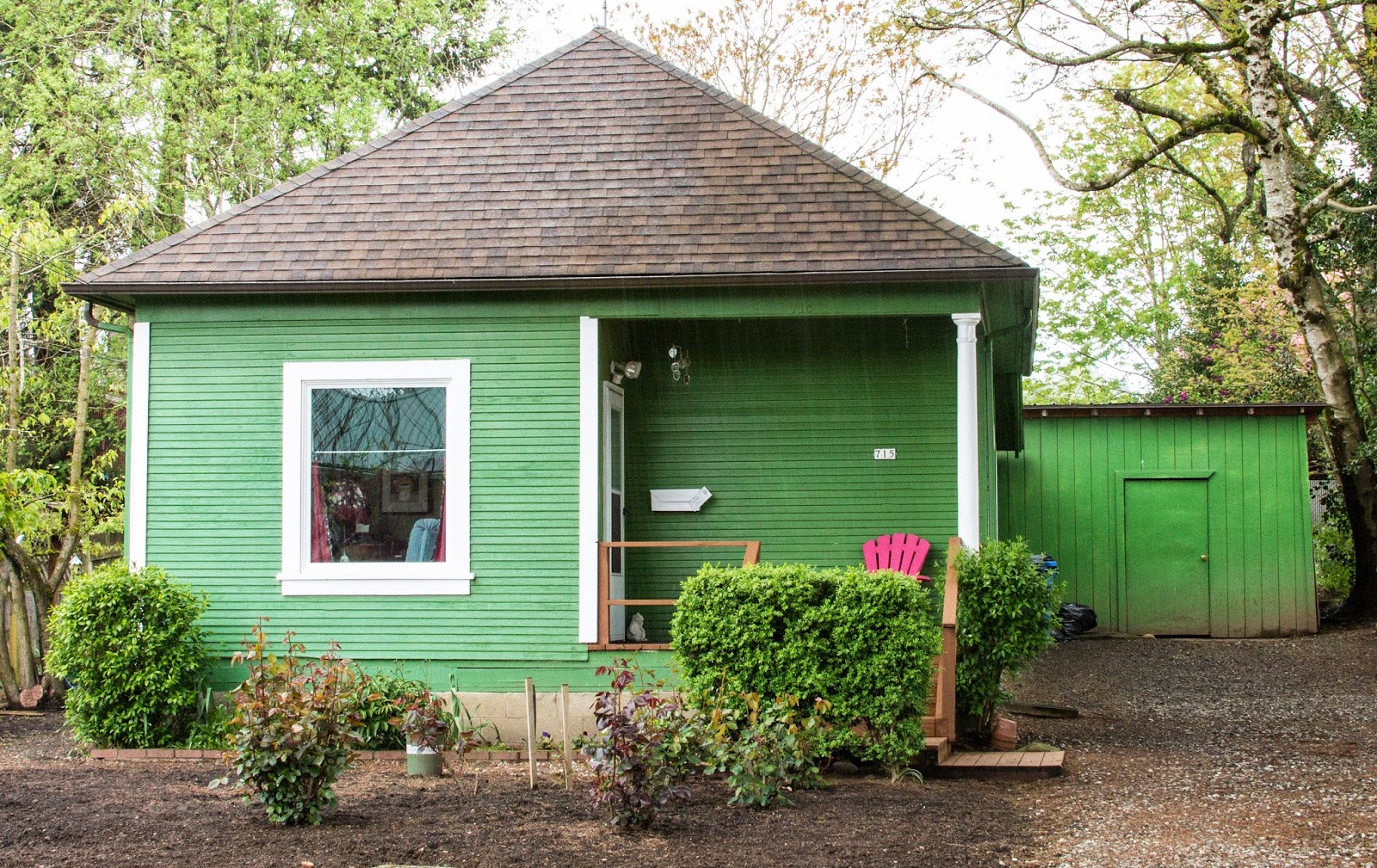 Located in a residential area -- even though small in size -- this home stood out with its refreshing color of green. A home well taken care of -- its age is about one hundred or so. Vernacular because it was the popular or traditional style of its era. Sweet place found in Camas, Washington!